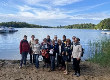In einer herrlichen Natur und meistens im Sonnenschein laufen wir um alle Seen herum (manche springen auch rein) und durfen die Tage in einem alten Pfarrhaus am Haussee verbringen. Ein besonderes Geschenk: Wir singen und beten miteinander an einem Abend in der Himmelpforter Kirche ganz allein – und die Küsterin läutet eigens für uns die Glocken.