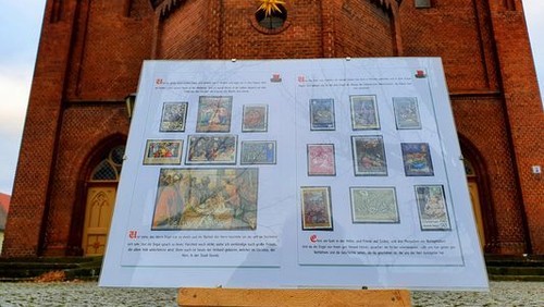 So wird die Geschichte der Geburt Jesu Christi auf mehreren Tafeln auf außergewöhnliche Weise mithilfe der gezackten Bildchen erzählt.